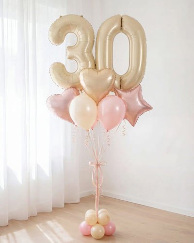 Un delicado y sumamente elegante bouquet de globos con helio, protagonizado por números gigantes en un sofisticado tono champagne mate. Complementado con toques de rosa pastel y crema, este arreglo masivo es la opción perfecta para celebrar cambios de década con un estilo moderno, suave y muy chic.